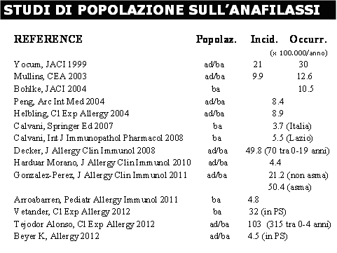 Ancora oggi è difficile definire quale sia l’esatta frequenza dell’anafilassi nella popolazione. . Gli studi di incidenza dell’anafilassi hanno prodotto risultati assai differenti, in rapporto all’età della popolazione studiata, al setting operativo, al disegno dello studio e alla definizione stessa adoperata per caratterizzare l’evento. Per quanto concerne l’incidenza, nel complesso gli studi population-based sono assai pochi e la maggioranza di essi include pazienti sia pediatrici che adulti e ha un disegno retrospettivo. Grossolanamente si può ritenere che l’incidenza reale dell’anafilassi oscilli tra 3.2/100.000 e 90/100.000 individuo-anno. Limitandosi comunque a considerare solo gli studi più recenti population-based e nei quali siano stati inclusi tutti i casi di anafilassi, a prescindere dalla presenza o meno di interessamento cardio-circolatorio (rilevabile in non più del 10-25% del totale dei casi), i pochi lavori disponibili hanno riportato un’incidenza variabile da 3.7 e 103 su 100000 individui-anno. (Tabella 1)