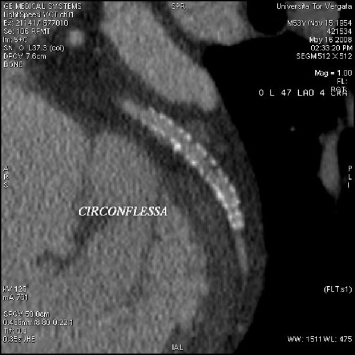 Figura 2 Esempio di stent coronarico su circonflessa che alla valutazione con TC risulta pervio